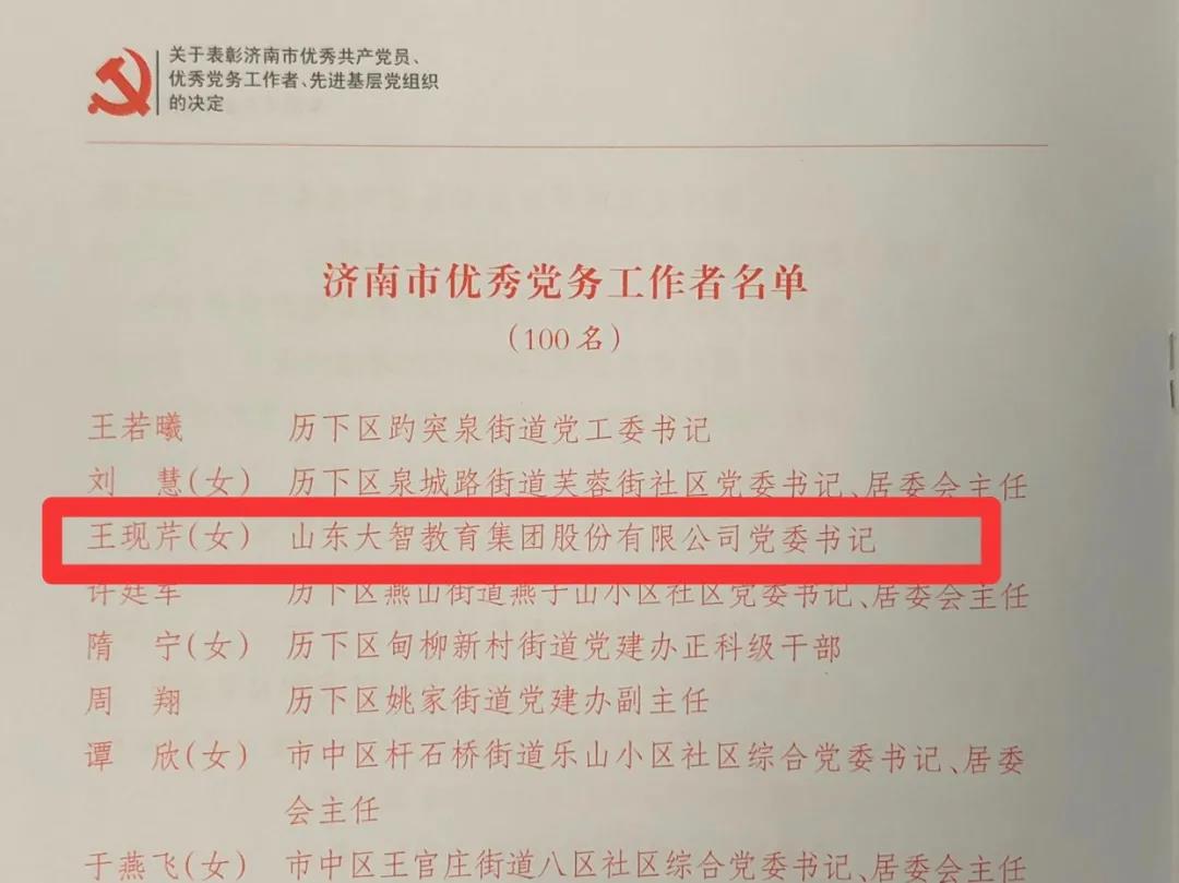 6月28日,在即將迎來(lái)中國(guó)共產(chǎn)黨百年華誕之際,濟(jì)南市優(yōu)秀共產(chǎn)黨員、優(yōu)秀黨務(wù)工作者和先進(jìn)基層黨組織表彰大會(huì)成功舉辦,省委常委、市委書記孫立成出席會(huì)議并講話。大智教育集團(tuán)黨委書記王現(xiàn)芹榮獲“優(yōu)秀黨務(wù)工作者”稱號(hào)并作為代表上臺(tái)領(lǐng)獎(jiǎng)。