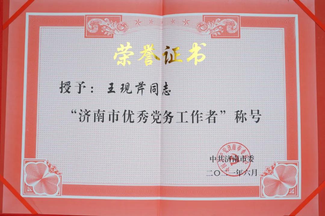 在黨建工作中,王現(xiàn)芹創(chuàng)造性提出了“黨務(wù)支持業(yè)務(wù),業(yè)務(wù)反哺黨務(wù)”黨建工作理念,在實(shí)踐探索中形成了“智惠黨建一三九”工作模式,實(shí)現(xiàn)黨建工作與企業(yè)發(fā)展同推共進(jìn);創(chuàng)建“智惠e”公益品牌,積極踐行社會(huì)責(zé)任;積極承辦濟(jì)南市民營(yíng)經(jīng)濟(jì)高質(zhì)量發(fā)展服務(wù)隊(duì)的“百+黨建工程”,協(xié)助近百家民營(yíng)企業(yè)建立黨組織,提升黨建工作水平。
