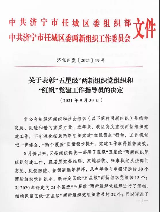 近日,中共濟寧市任城區(qū)委組織部、中共濟寧市任城區(qū)委兩新組織工作委員會發(fā)布《關于表彰“五星級”兩新組織黨組織和“紅帆”黨建工作指導員的決定》(濟任組發(fā)〔2021〕19號)有關規(guī)定,大智濟寧區(qū)域黨支部榮獲任城區(qū)“五星級”黨組織稱號!