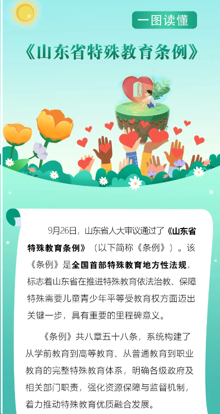 9月26日,山東省第十四屆人民代表大會常務(wù)委員會第十七次會議通過了《山東省特殊教育條例》?!稐l例》自2026年1月1日起施行,一起來看具體內(nèi)...