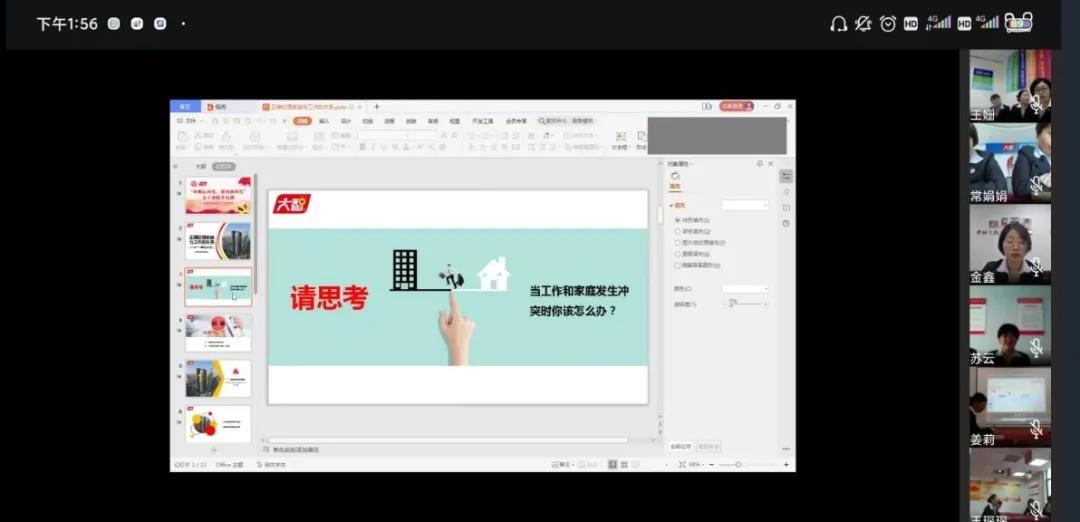 首先,王現(xiàn)芹用問(wèn)題拋磚引玉:“當(dāng)工作和家庭發(fā)生沖突時(shí)你該怎么辦?”隨后,王現(xiàn)芹從家庭與工作的關(guān)系、平衡家庭與工作的小技巧兩個(gè)方面,結(jié)合自身的實(shí)踐和經(jīng)歷,為大家詳細(xì)講解了該如何正確處理工作和家庭的關(guān)系。